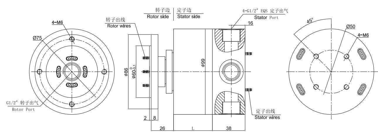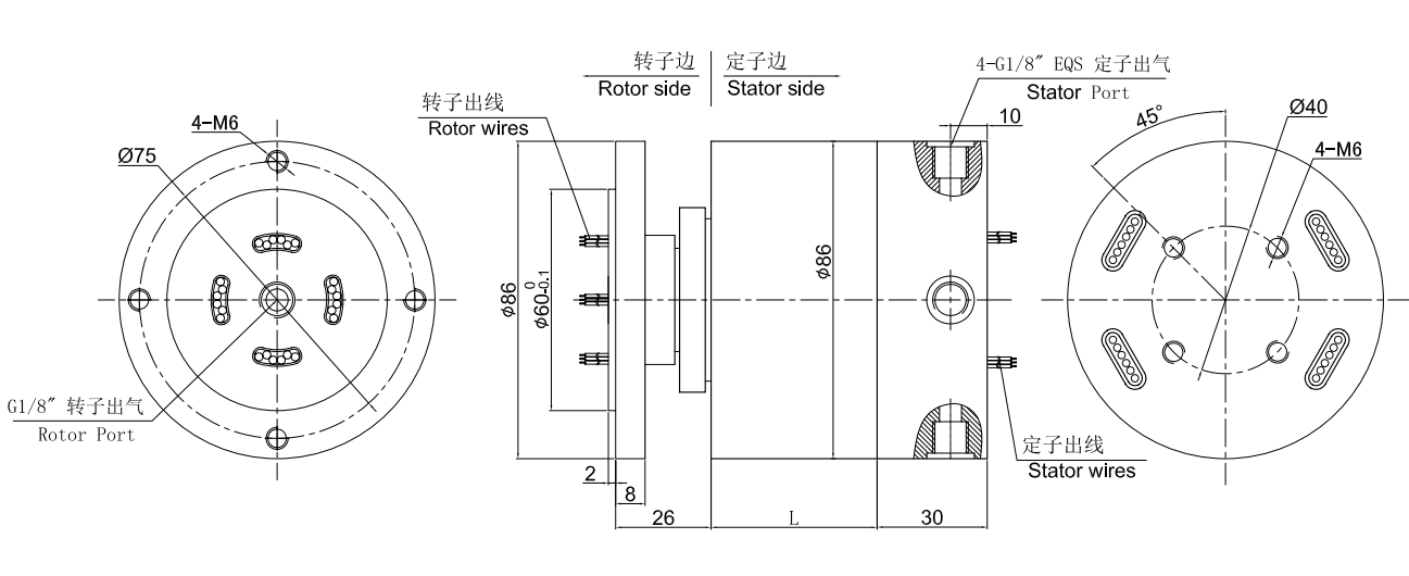• · 標(biāo)準(zhǔn)為法蘭安裝形式,可定制空心軸安裝氣/液+電一體滑環(huán),旋轉(zhuǎn)接頭