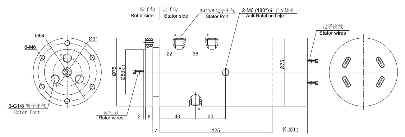 • · 標準為法蘭安裝形式,3進3出旋轉(zhuǎn)接頭,3路氣液滑環(huán),氣液電組合滑環(huán)可定制空心軸安裝
