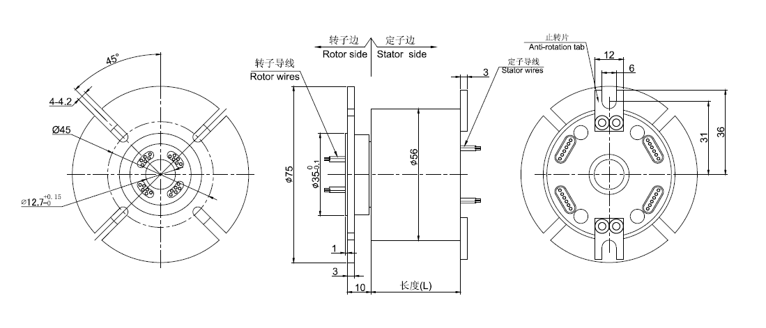 • · 轉(zhuǎn)子帶法蘭安裝, 通孔直徑為12.7mm(1/2",適用于<=12.7mm)的標(biāo)準(zhǔn)系列整體式精密導(dǎo)電滑環(huán)。*注意:如需<12.7mm的內(nèi)孔,可通過(guò)加內(nèi)襯軸套解決。