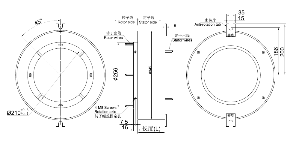 • · 通孔直徑為210mm(適用于<=210mm)的標(biāo)準(zhǔn)系列整體式精密導(dǎo)電滑環(huán)。*注意:如需<210mm的內(nèi)孔,可通過(guò)加內(nèi)襯軸套解決。